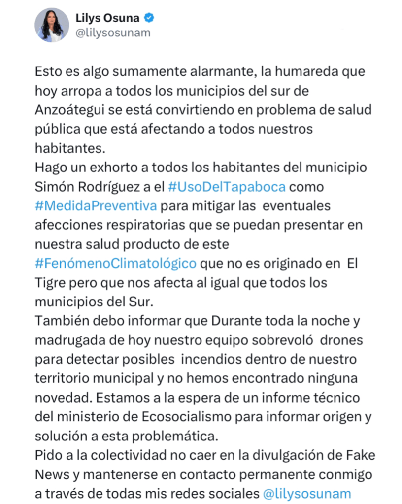 A través de las redes sociales, la Alcaldesa del municipio Simón Rodríguez, Lilys Osuna, denunció la presencia de humarada en todos los municipios del sur del estado Anzoátegui, la cual afecta la salud de los habitantes de estas zonas.
