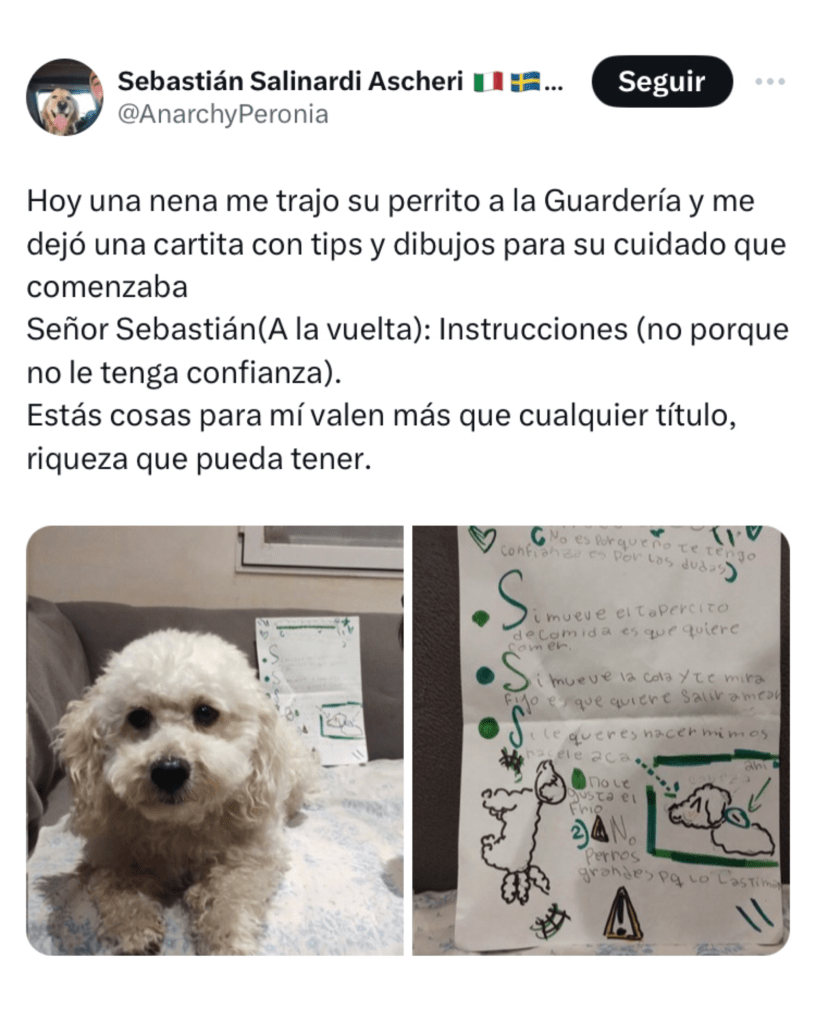 El usuario de X Sebastián Salinardi Ascheri compartió una tierna anécdota que le pasó mientras atendía en su guardería de mascotas.