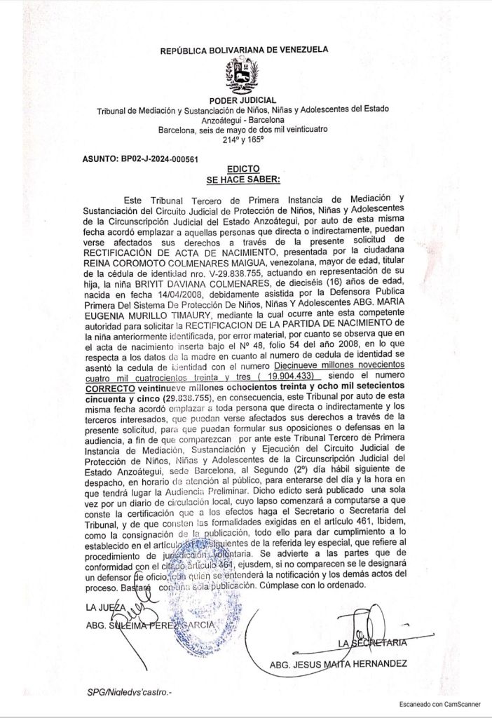 Tribunal Tercero de Primera Instancia de Mediación y Sustanciación del Circuito Judicial de Protección de Niños, Niñas y Adolescentes de la Circunscripción Judicial del Estado Anzoátegui, por auto de esta misma fecha acordó emplazar a aquellas personas que directa o indirectamente, puedan verse afectados sus derechos a través de la presente solicitud de: