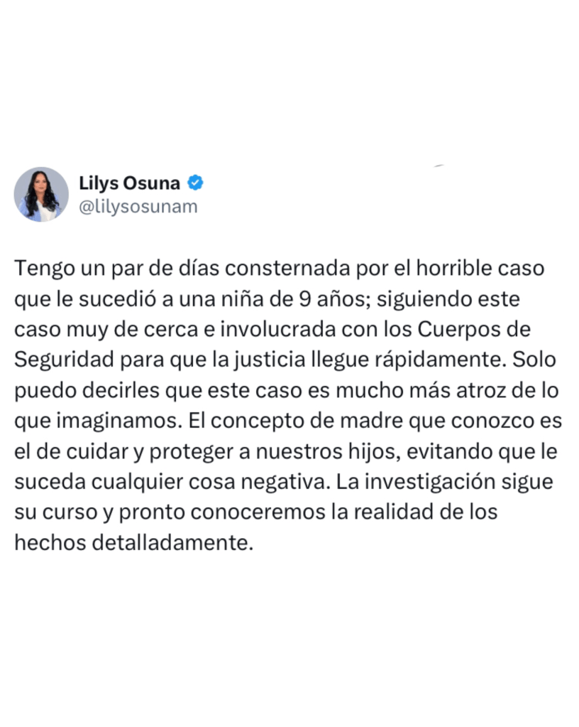 “Tengo un par de días consternada por el horrible caso que le sucedió a una niña de 9 años; siguiendo este caso muy de cerca e involucrada con los Cuerpos de Seguridad para que la justicia llegue rápidamente. Solo puedo decirles que este caso es mucho más atroz de lo que imaginamos. El concepto de madre que conozco es el de cuidar y proteger a nuestros hijos, evitando que le suceda cualquier cosa negativa. La investigación sigue su curso y pronto conoceremos la realidad de los hechos detalladamente”.