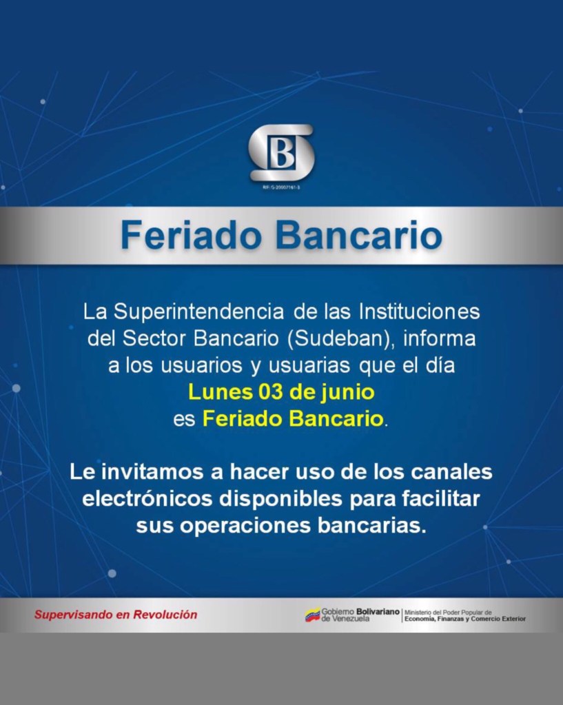 La Superintendencia de las Instituciones del Sector Bancario (Sudeban), informó que este lunes 3 de junio será feriado bancario, por lo que la banca pública y privada venezolana no prestará servicio presencial, esto en honor a la conmemoración del día de Corpus Christi, celebrado el pasado 30 de mayo.