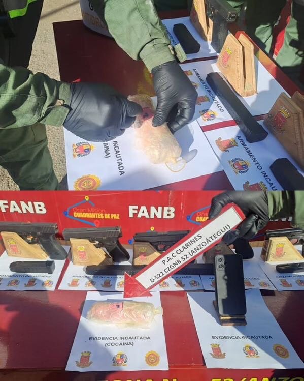Los Centinelas de la FANB en el Punto de Atención al Ciudadano de Clarines, en la Troncal 9 del Estado Anzoátegui, capturaron a un ciudadano que portaba cinco armas de fuego y más de 360 gramos de cocaína.