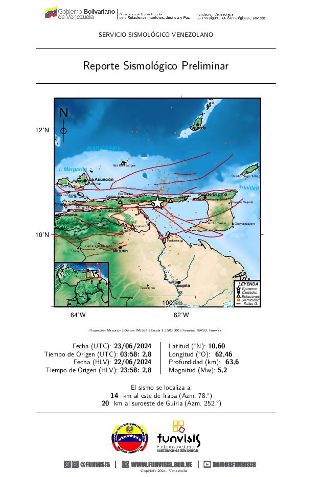 FUNVISIS informó que a las 11:58 pm de este sábado 22 de junio se registró un sismo de magnitud 5.2 grados con profundidad 63.6, con epicentro a 14 km al este de Irapa, en el estado Sucre.