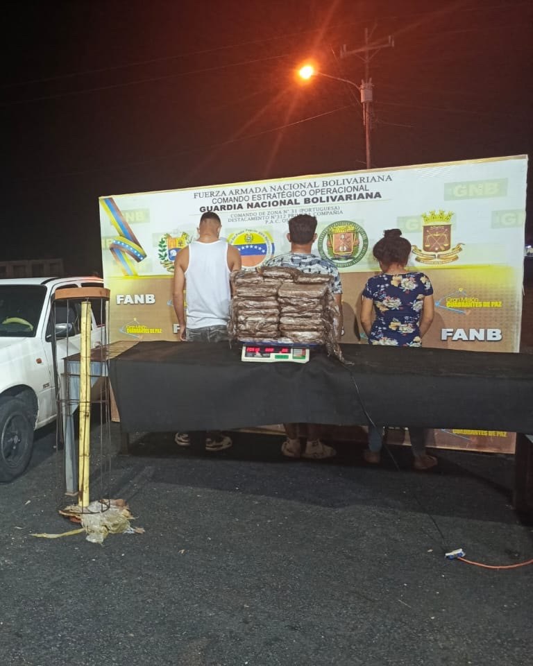 El jefe del Estado Mayor del Comando Nacional Antidrogas de la Guardia Nacional Bolivariana (GNB), Leonardo Quintero, informó el 8 de julio la detención de tres personas que transportaban 30,29 kilogramos de marihuana en el estado Portuguesa.