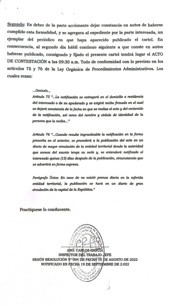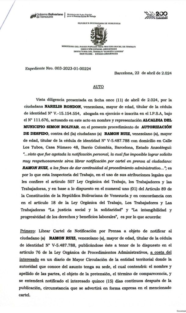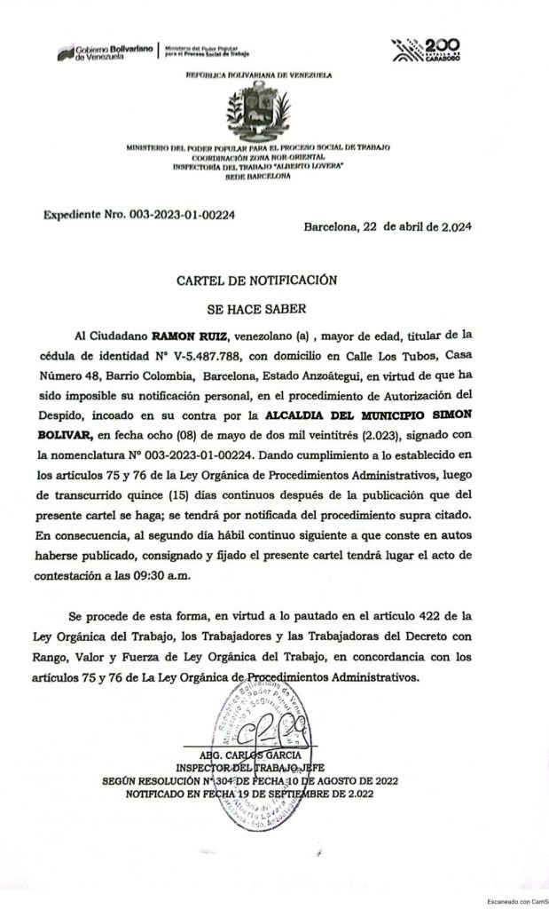 La Alcaldía del Municipio Simón Bolívar del estado Anzoátegui notifica:
