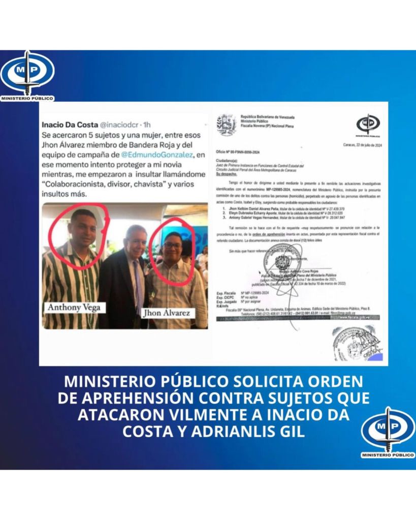 En su cuenta de X, Saab detalló que el Ministerio Público decidió solicitar órdenes de aprehensión contra Anthony Vega, Jhon Álvarez y Eleyn Echarry por los delitos de homicidio calificado en grado de frustración, lesiones personales y agavillamiento contra el diputado opositor Inacio Da Costa y Adrianlis Gil.