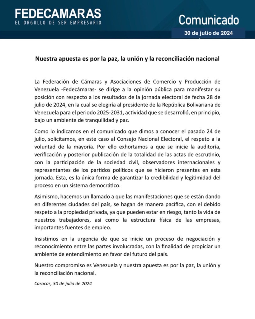 La Federación de Cámaras y Asociaciones de Comercio y Producción de Venezuela (Fedecámaras) exhortó al Consejo Nacional Electoral (CNE) a que inicie la auditoría, verificación y posterior publicación de la totalidad de las actas de escrutinio tras los resultados de las elecciones del pasado 28 de julio de 2024.