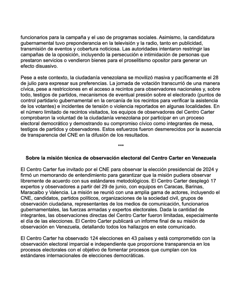 El Centro Carter aseguró este martes 30 de julio que no pudo verificar los resultados de las elecciones presidenciales en Venezuela, en las que el Consejo Nacional Electoral (CNE) dio el triunfo a Nicolás Maduro.