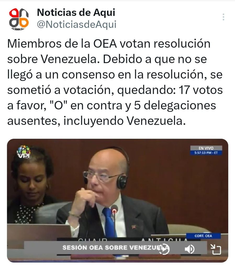 Miembros de la OEA votan resolución sobre Venezuela. Debido a que no se llegó a un consenso en la resolución, se sometió a votación, quedando: 17 votos a favor, «O» en contra y 5 delegaciones ausentes, incluyendo Venezuela.