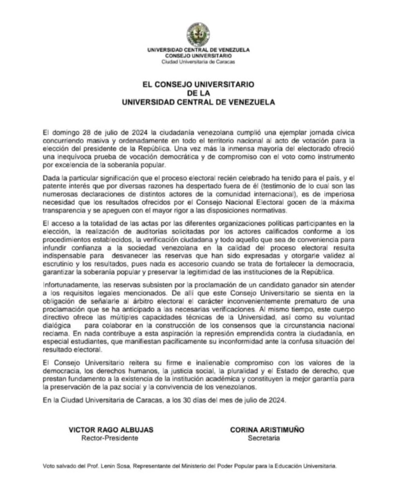 El Consejo Universitario de la Universidad Central de Venezuela (UCV) ha emitido un comunicado oficial en el que pone a disposición de las autoridades electorales la capacidad técnica de la casa de estudios para auditar los resultados de las recientes elecciones.