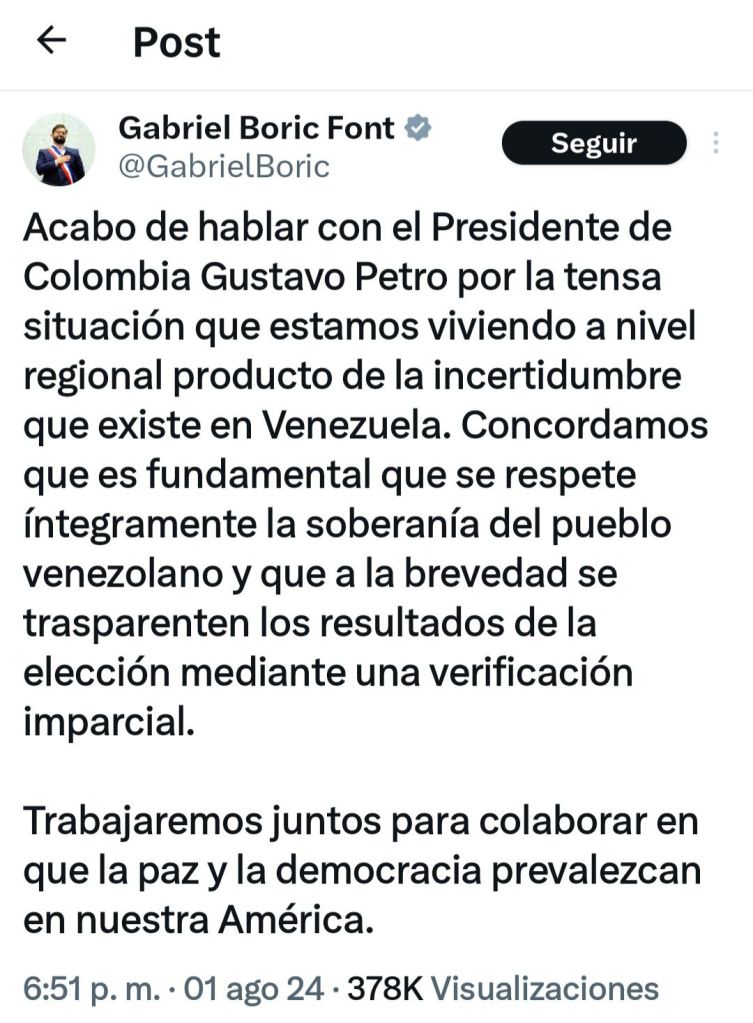 Acabo de hablar con el Presidente de Colombia Gustavo Petro por la tensa situación que estamos viviendo a nivel regional producto de la incertidumbre que existe en Venezuela. Concordamos que es fundamental que se respete íntegramente la soberanía del pueblo venezolano y que a la brevedad se trasparenten los resultados de la elección mediante una verificación imparcial.
