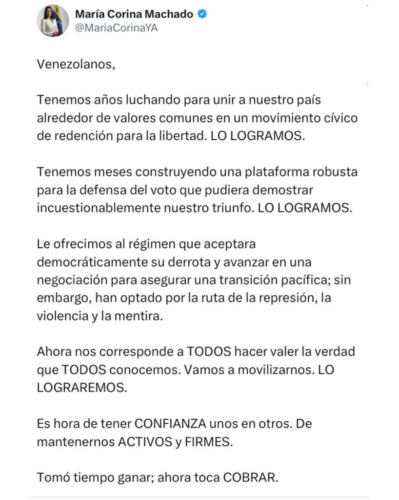 “Ahora nos corresponde a todos hacer valer la verdad que todos conocemos. Vamos a movilizarnos. Lo lograremos. Es hora de tener confianza unos en otros. De mantenernos activos y firmes. Tomó tiempo ganar; ahora toca cobrar”, afirmó Machado.