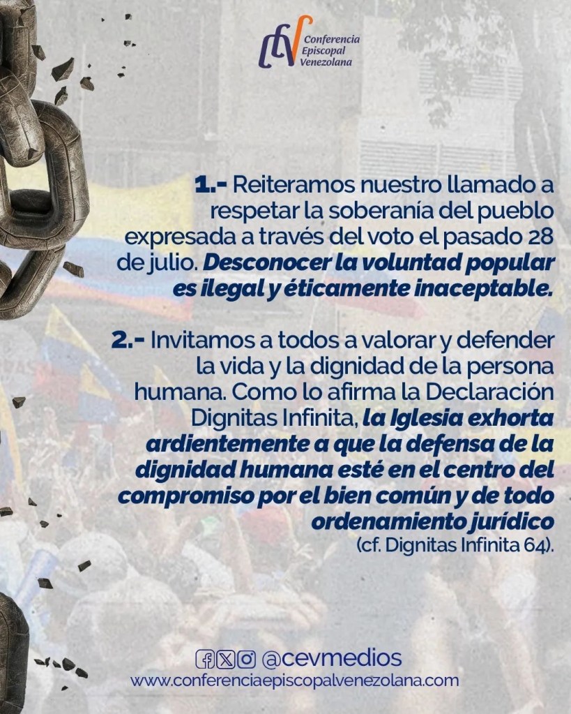 La Conferencia Episcopal Venezuela expresó este miércoles que desconocer la voluntad popular «es ilegal y éticamente inaceptable», haciendo referencia a los cuestionados comicios presidenciales del pasado 28 de julio en el que el Consejo Nacional Electoral proclamó a Nicolás Maduro como ganador.