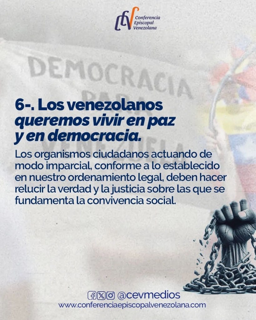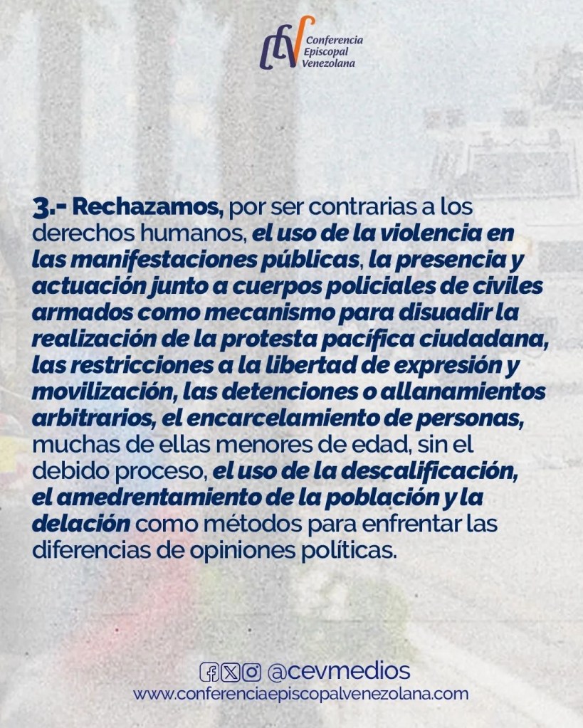 Finalmente, la Conferencia Episcopal Venezuela llamó a los órganos del Estado a cumplir y hacer cumplir la Constitución y las leyes de la República.