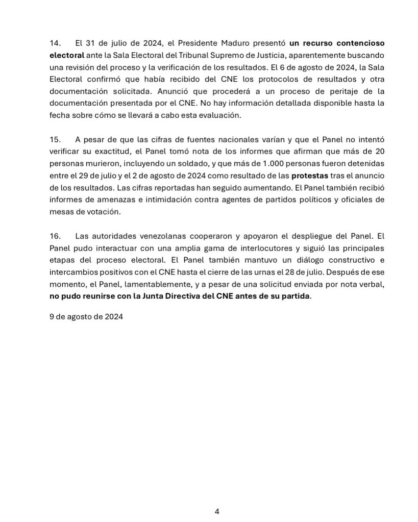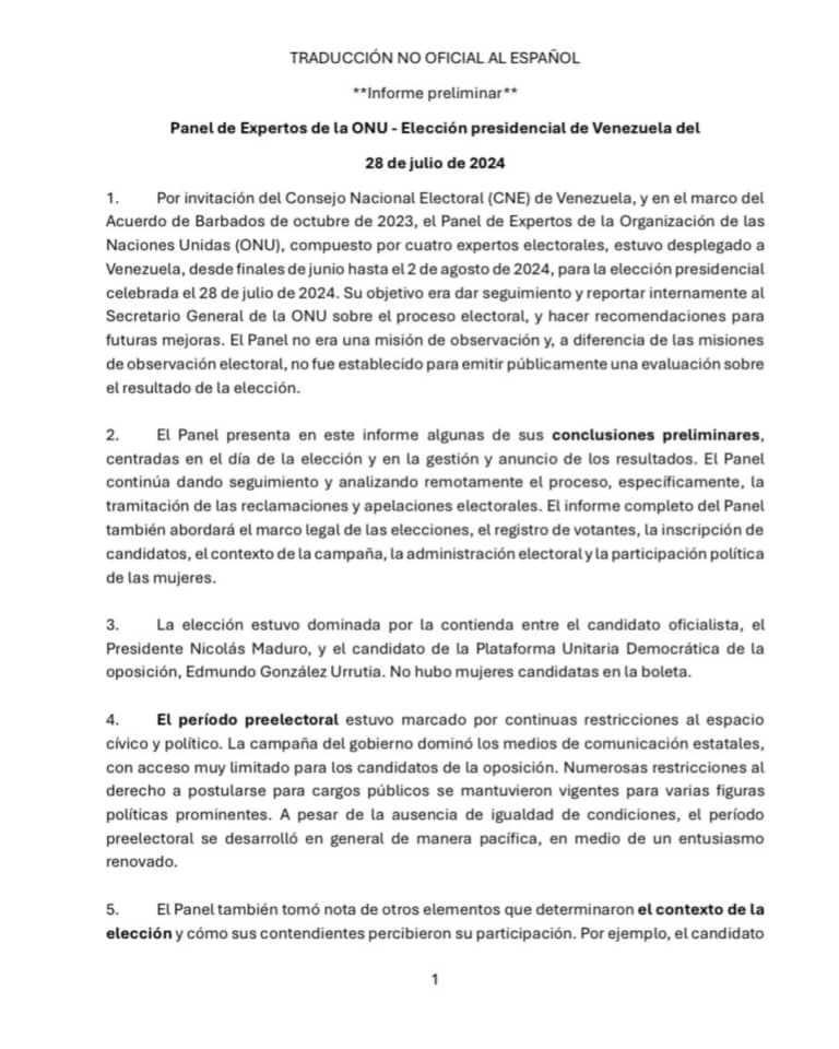 👉🏻El Panel de Expertos de la Organización de las Naciones Unidas (ONU), compuesto por cuatro expertos electorales, presentó este martes un informe con algunas de sus conclusiones preliminares centradas en el día de la elección presidencial en Venezuela y en la gestión y anuncio de los resultados.
