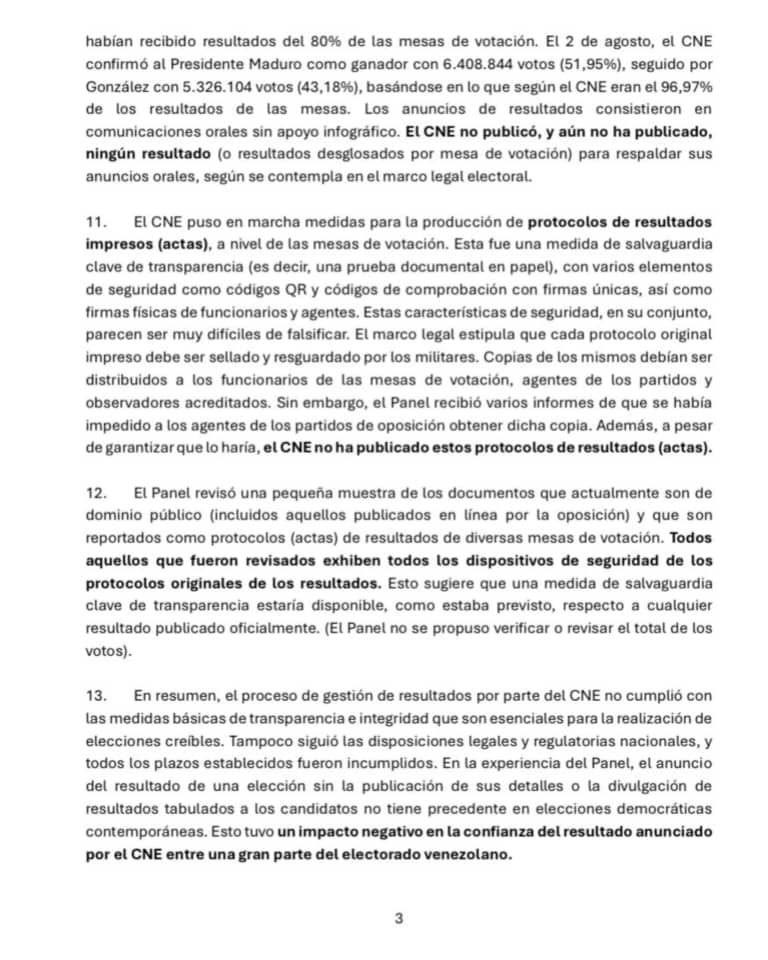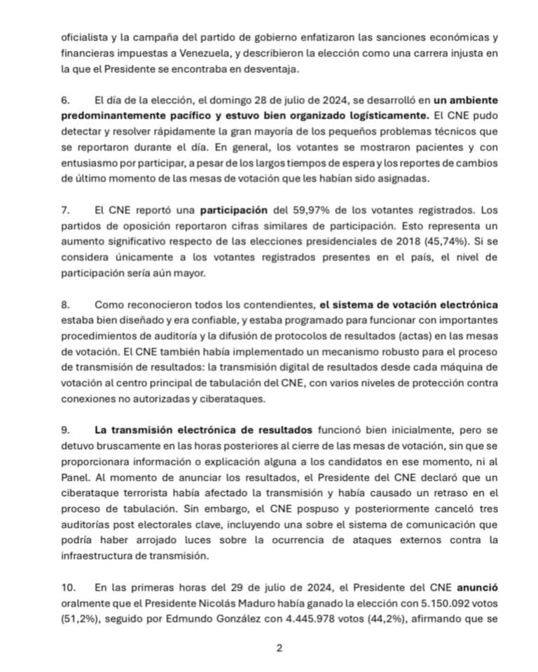 Apunta además que, en la experiencia del Panel, «el anuncio del resultado de una elección sin la publicación de sus detalles o la divulgación de resultados tabulados a los candidatos no tiene precedente en elecciones democráticas contemporáneas».