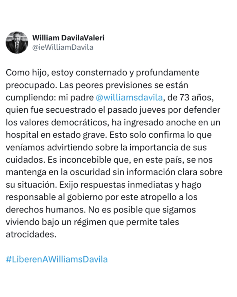 “Como hijo, estoy consternado y profundamente preocupado. Las peores previsiones se están cumpliendo: mi padre @williamsdavila, de 73 años, quien fue secuestrado el pasado jueves por defender los valores democráticos, ha ingresado anoche en un hospital en estado grave. Esto solo confirma lo que veníamos advirtiendo sobre la importancia de sus cuidados. Es inconcebible que, en este país, se nos mantenga en la oscuridad sin información clara sobre su situación. Exijo respuestas inmediatas y hago responsable al gobierno por este atropello a los derechos humanos. No es posible que sigamos viviendo bajo un régimen que permite tales atrocidades”, publicó Dávila Valeri sobre el estado de su padre en su cuenta de la red social X.