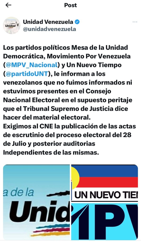 Los partidos políticos agrupados en la Plataforma Unitaria Democrática (PUD) reiteraron que no están participando en el proceso de peritaje que lleva a cabo el Tribunal Supero de Justicia (TSJ) para validar las actas electorales de la elección presidencial del pasado 28 de julio. Así lo manifestaron este lunes, 19 de agosto.