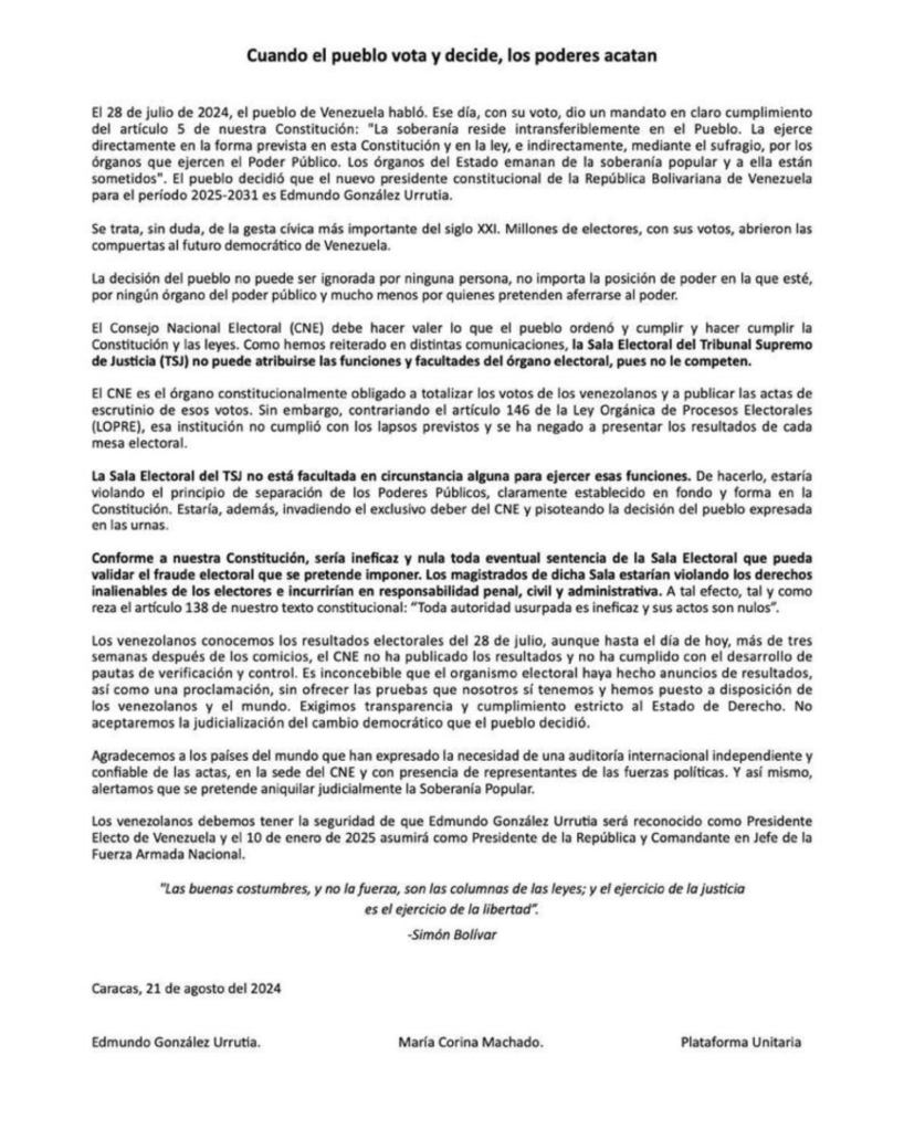 María Corina Machado y Edmundo González hicieron una denuncia este miércoles, 21 de agosto, en la que señalaron una presunta maniobra para validar un “fraude electoral” a través del Tribunal Supremo de Justicia (TSJ).