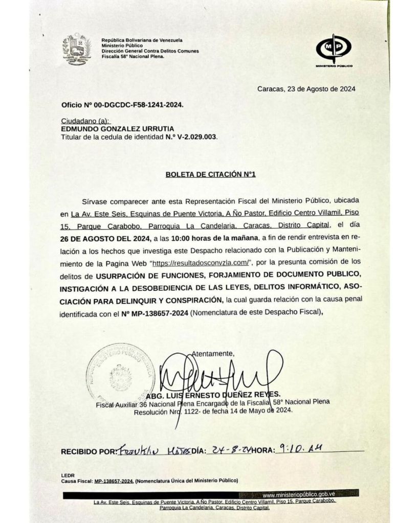 Edmundo González Urrutia para rendir declaraciones en torno a su presunta responsabilidad en los delitos de: usurpación de funciones, forjamiento de documento público, instigación a la desobediencia de las leyes, delitos informáticos, asociación para delinquir y conspiración.