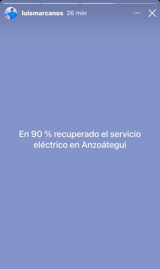 El gobernador del estado Anzoátegui, Luis Marcano informó aproximadamente a las 10:30 pm de este viernes 30 de agosto, a través de sus redes que más de 90% de la carga de energía eléctrica ya ha sido restituida en la entidad, tras el apagón que afectó a gran parte del territorio nacional.