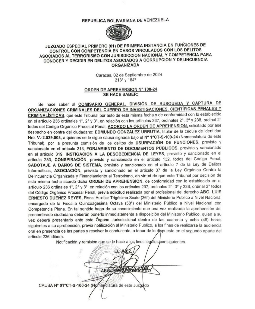 Señalan que: El tribunal de primera instancia en funciones de control a nivel nacional acuerda orden de aprehensión contra Edmundo González Urrutia por graves