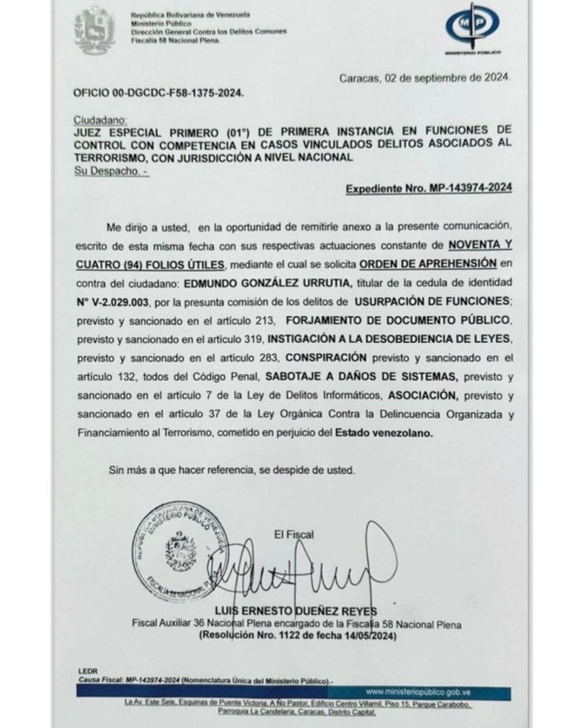 Según una nota emanada de la Fiscalía este 2 de septiembre, solicitaron al juez especial primero de primera instancia en casos de terrorismo la orden de captura, acusando al excandidato opositor de usurpación de funciones, forjamiento de documento público, instigación a la desobediencia de leyes, conspiración, sabotaje a daños de sistemas y asociación.
