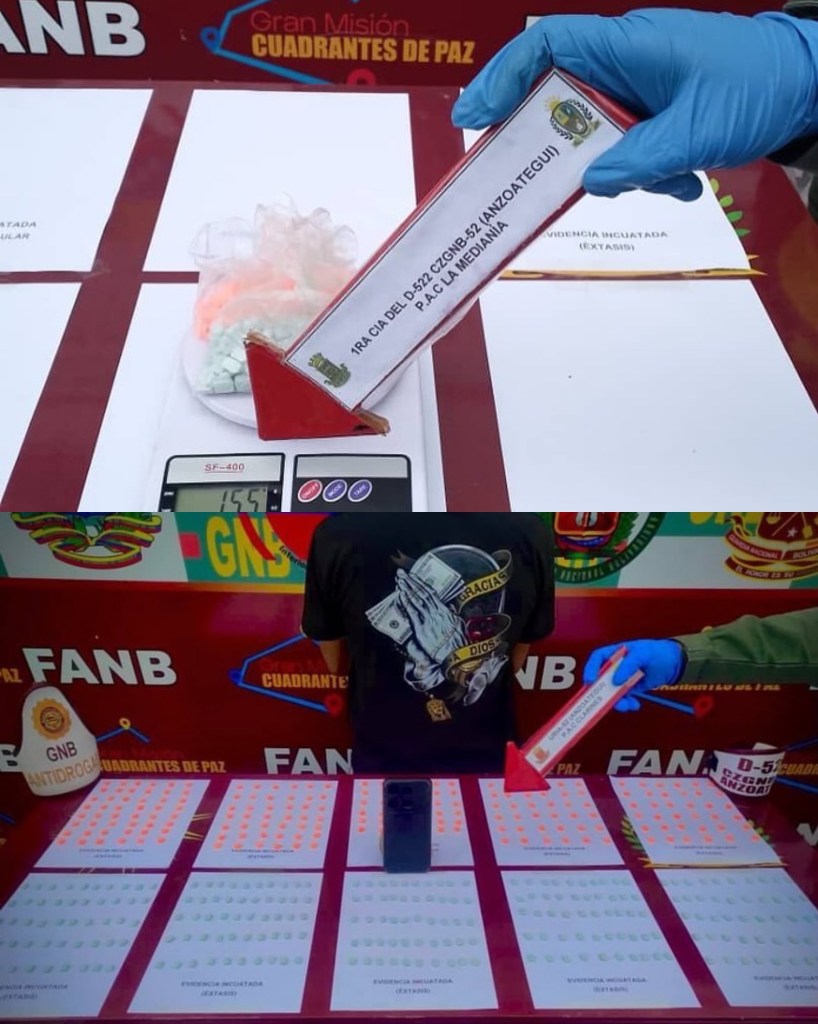 Funcionarios de la Guardia Nacional Bolivariana (GNB) decomisaron 450 pastillas de éxtasis en un autobús que se dirigía de Caracas a Cumaná. La droga, con un peso total de 155 gramos, estaba oculta en el equipaje de un pasajero.