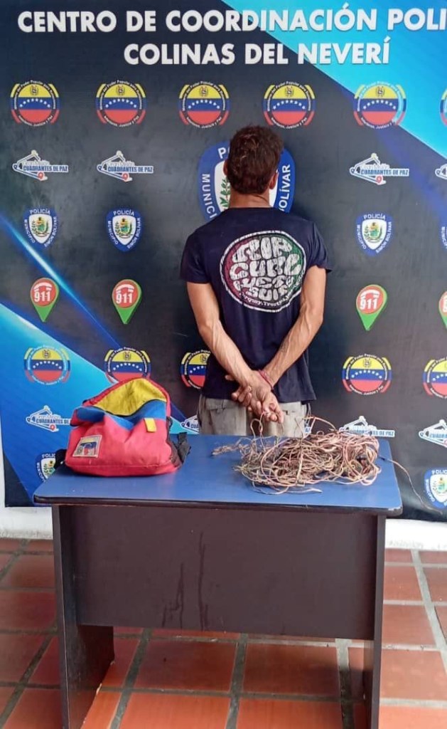 Indicó Ferrer que, una vez en sitio encontraron a un hombre en actividades sospechosa, por lo que se procedió a darle la voz de alto, la cual acató. Al inspeccionar el lugar los uniformados se logran percatar que el sujeto se encontraba quemando unos cables, para sustraer de ellos el cobre, material estratégico que estaba guardando dentro de un bolso tipo morral.