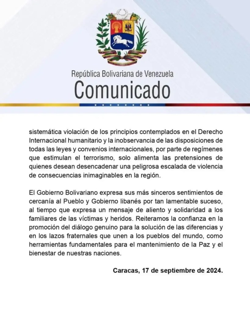 Así reseñó un comunicado oficial emitido por la Cancillería del país bolivariano, donde se deplora la explosión de los localizadores personales de miles de personas a causa del ataque israelí el cual, además, generó pánico y zozobra entre la población civil indefensa del Líbano.
