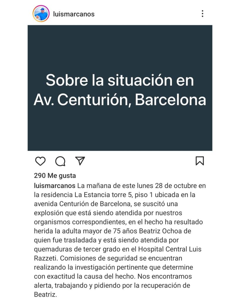 Cerca de las 7:00 de la mañana de este lunes 28 de octubre se produjo una explosión y posterior incendio en el apartamento 5-1-1 de la segunda etapa del Conjunto Residencial La Estancia en Barcelona, confirmado por las autoridades una persona resultó lesionada.Se trata de Beatriz Ochoa de 75 años, quien vive sola en el apartamento, sufrió quemaduras en gran parte de su cuerpo y fue trasladada a la Unidad de Cuidados Intensivos del Hospital Razetti de Barcelona.
