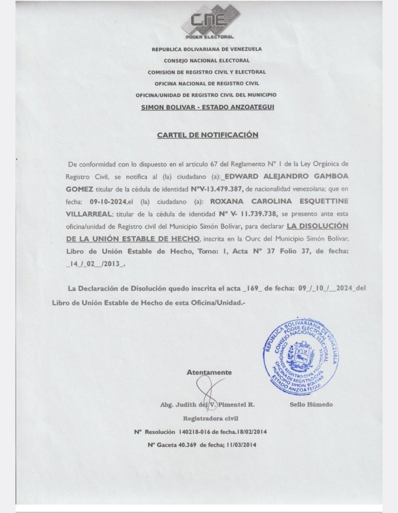 De conformidad con lo dispuesto en el articulo 67 del Reglamento No I de la Ley Orgánica de Registro Civil, e notifica al (la) ciudadano (a): EDWARD ALEJANDRO GAMBOA GOMEZ titular de la cédula de identidad Noy-|3.479.387, de nacionalidad venezolana; que en fecha: 09-10-2024,el (la) ciudadano (a): ROXANA CAROLINA ESQUETTINE VILLARREAL; titular de la cédula de identidad Ne V- 11.739.738, se presento ante esta oficina/unidad de Registro civil del Municipio Simón Bolivar, para declarar LA_DISOLUCIÓN DE LA UNIÓN ESTABLE DE HECHO, inscrita en la Ourc del Municipio Simón Bolivar, Libro de Unión Estable de Hecho, Tomo: I, Acta No 37 Folio 37, de fecha: _14/02_/2013_.