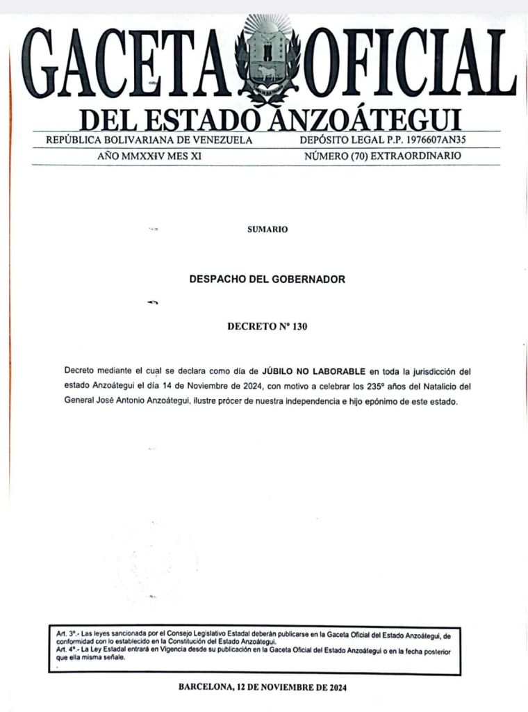 El gobernador Luis Marcano firmó el DECRETO No 130 mediante el cual se declara como día de JÚBILO NO LABORABLE en toda la jurisdicción del