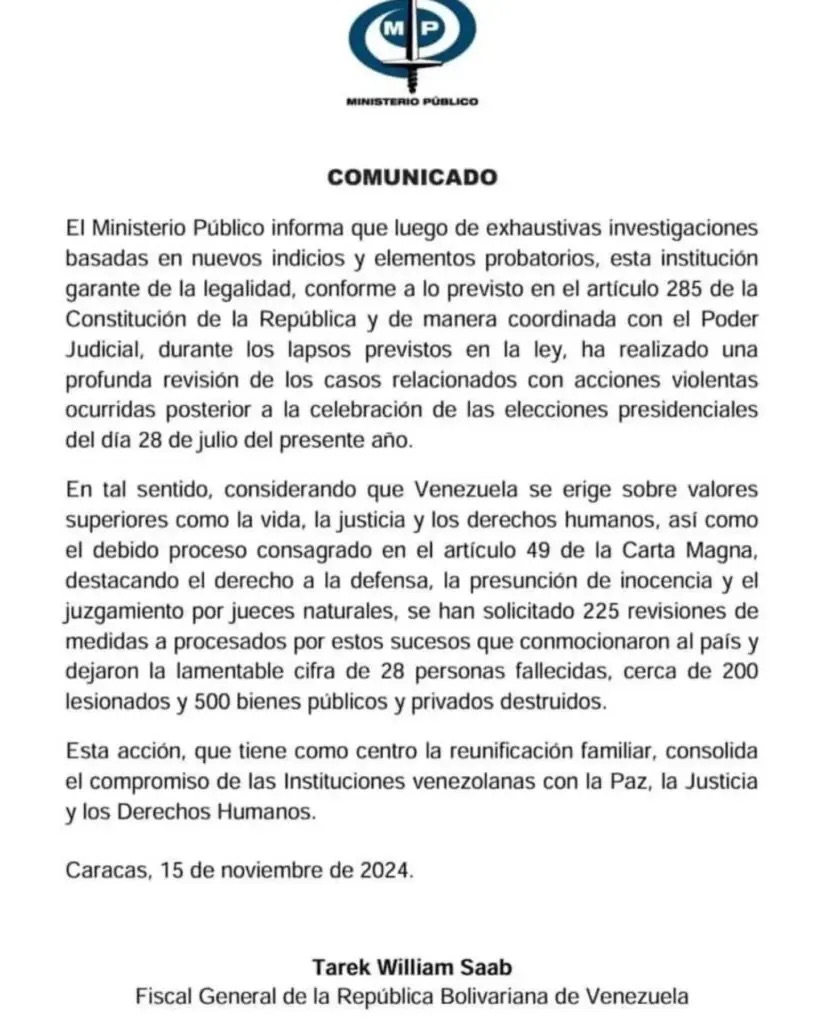 “El Ministerio Público informa que luego de exhaustivas investigaciones basadas en nuevos indicios y elementos probatorios, esta institución garante de la legalidad, conforme a lo previsto en el artículo 285 de la Constitución de la República y de manera coordinada con el Poder Judicial, durante los lapsos previstos en la ley, ha realizado una profunda revisión de los casos relacionados con acciones violentas ocurridas posterior a la celebración de las elecciones presidenciales del día 28 de julio del presente año.