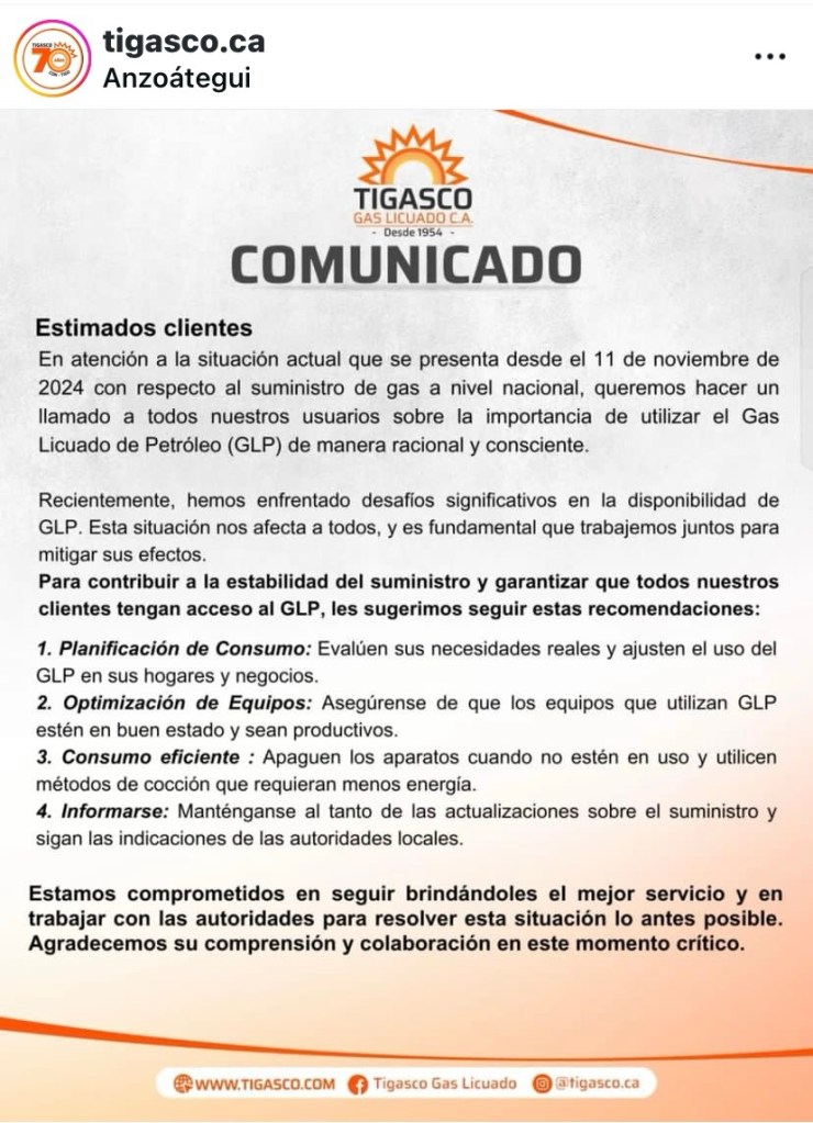 La empresa Tigasco, hizo un llamado este jueves 21 de noviembre a sus usuarios a hacer un uso racional y consciente del gas en “Atención a la situación actual que se presenta desde el 11 de noviembre con respecto al suministro de gas a nivel nacional”, en referencia a la explosión de la planta Muscar en el estado Monagas.