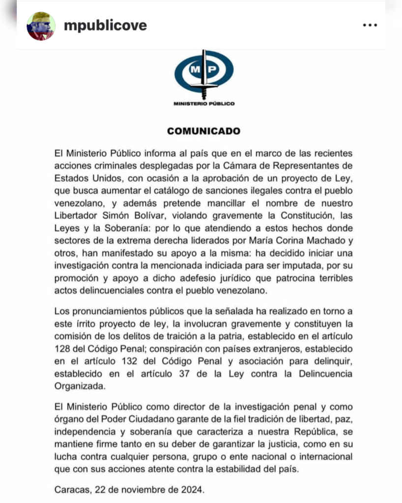 A través de un comunicado publicado en Instagram, el Ministerio Público, sostuvo que decidió iniciar esta investigación contra Machado para «ser imputada por su promoción y apoyo a dicho adefesio jurídico que patrocina terribles actos delincuenciales contra el pueblo venezolano».