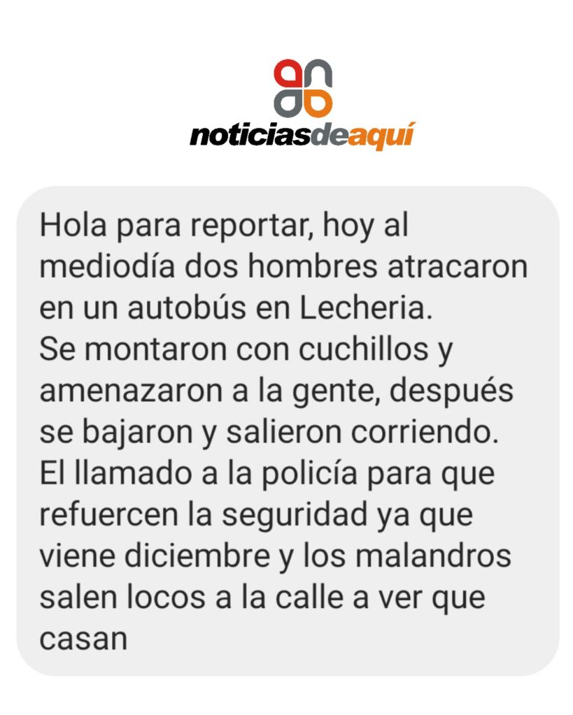 Pasadas las 12 del mediodía de este martes 26 de noviembre dos sujetos abordaron en la avenida Principal de Lechería un autobús que cubre la ruta Crucero-Lechería, inmediatamente sacaron armas blancas y sometieron a los pasajeros quienes fueron despojados de sus pertenencias.