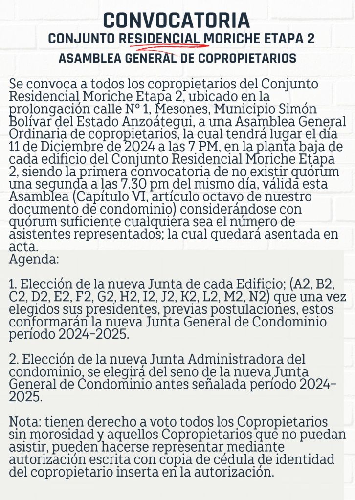Se convoca a todos los copropietarios del Conjunto Residencial Moriche Etapa 2, ubicado en la prolongación calle N° 1, Mesones, Municipio Simón Bolívar del Estado Anzoátegui, a una Asamblea General Ordinaria de copropietarios, la cual tendrá lugar el día 11 de Diciembre de 2024 a las 7 PM, en la planta baja de cada edificio del Conjunto Residencial Moriche Etapa 2, siendo la primera convocatoria de no existir quórum una segunda a las 7.30 pm del mismo día, válida esta Asamblea (Capítulo VI, artículo octavo de nuestro documento de condominio) considerándose con quórum suficiente cualquiera sea el número de asistentes representados; la cual quedará asentada en acta.