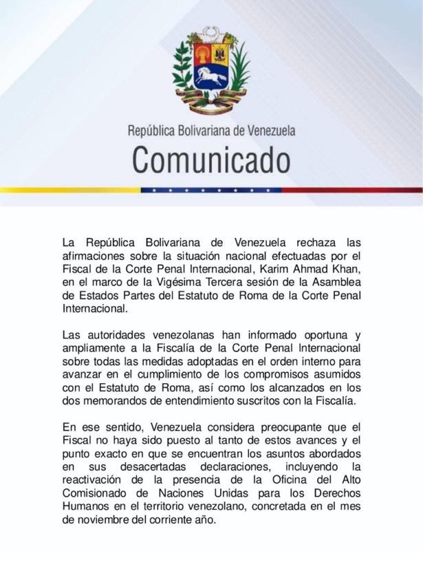 El Ejecutivo Nacional respondió este martes 3 de diciembre a las declaraciones del fiscal de la Corte Penal Internacional (CPI), Karim Khan, sobre la situación de Venezuela y el caso que se le sigue al Estado por la presunta comisión de crímenes de lesa humanidad al menos desde 2014.