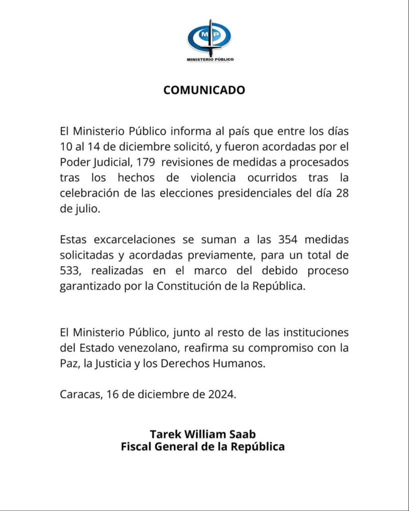 “El Ministerio Público informa al país que entre los días 10 al 14 de diciembre solicitó, y fueron acordadas por el Poder Judicial, 179 revisiones de medidas a procesados tras los hechos de violencia ocurridos tras la celebración de las elecciones presidenciales del día 28