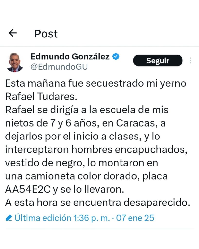 En su cuenta X dijo: «Esta mañana fue secuestrado mi yerno Rafael Tudares. Rafael se dirigía a la escuela de mis nietos a dejarlos por el inicio a clases, lo interceptaron hombres encapuchados, vestido de negro, lo montaron en una camioneta color dorado, placa AA54E2C 5y se lo llevaron. A esta hora se encuentra desaparecido».