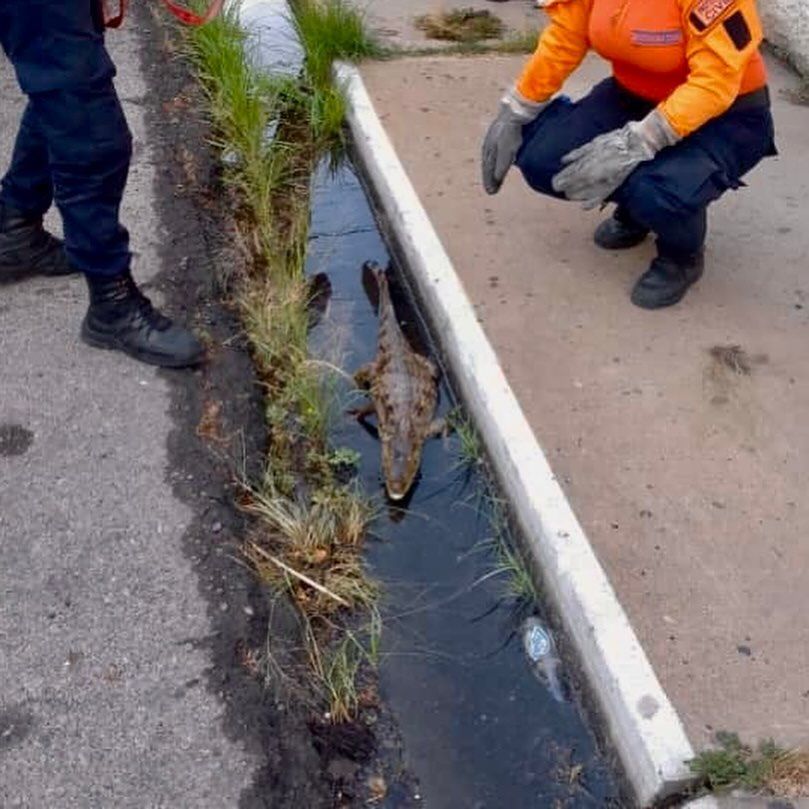Funcionarios de Protección Civil Urbaneja logró reubicar con éxito a un pequeño caimán que se hallaba lejos de su hábitat natural.