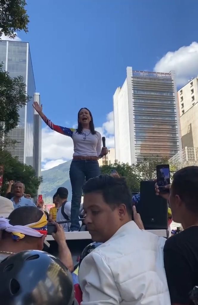 Después del mediodía la líder de la oposición llegó a la calle Élice de Caracas, subió a un camión y saludó a los presentes.