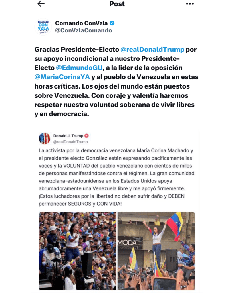 Desde el Comando con Venezuela, voceros de Machado y González agradecieron a Trump por su respaldo : Gracias Presidente-Electo realDonaldTrump por su apoyo incondicional a nuestro Presidente-Electo EdmundoGU, a la lider de la oposición MariaCorinaYA y al pueblo de Venezuela en estas horas críticas. Los ojos del mundo están puestos sobre Venezuela. Con coraje y valentía haremos respetar nuestra voluntad soberana de vivir libres y en democracia.