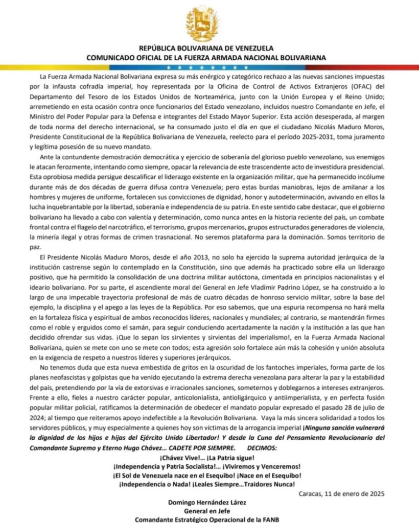 A través de un comunicado la Fuerza Armada Nacional Bolivariana rechazó las sanciones impuestas tras la juramentación de Nicolás Maduro para el período presidencial 2025-2031 a varios altos funcionarios del gobierno