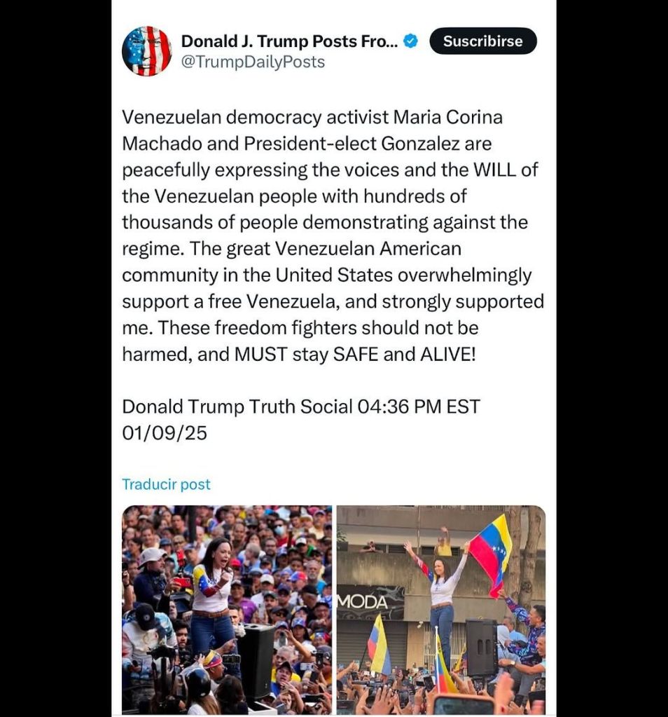 Este sábado 11 de enero, María Corina Machado usó sus redes sociales para agradecer al Presidente electo de Estados Unidos por el mensaje que envió el pasado 09 de enero, luego que desde el Comando Venezuela denunciaron que Machado había sido retenida por fuerzas policiales.