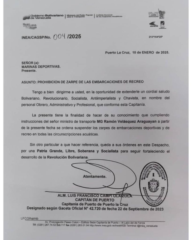 El jueves 09 en horas de la noche prestadores de servicio de la zona norte de Anzoátegui recibieron el oficio 004/2025 del INEA en donde se les informó que a partir del viernes 10 quedaba suspendido el zarpe de embarcaciones deportivas y de recreo “en todas las circunscripciones acuáticas”.