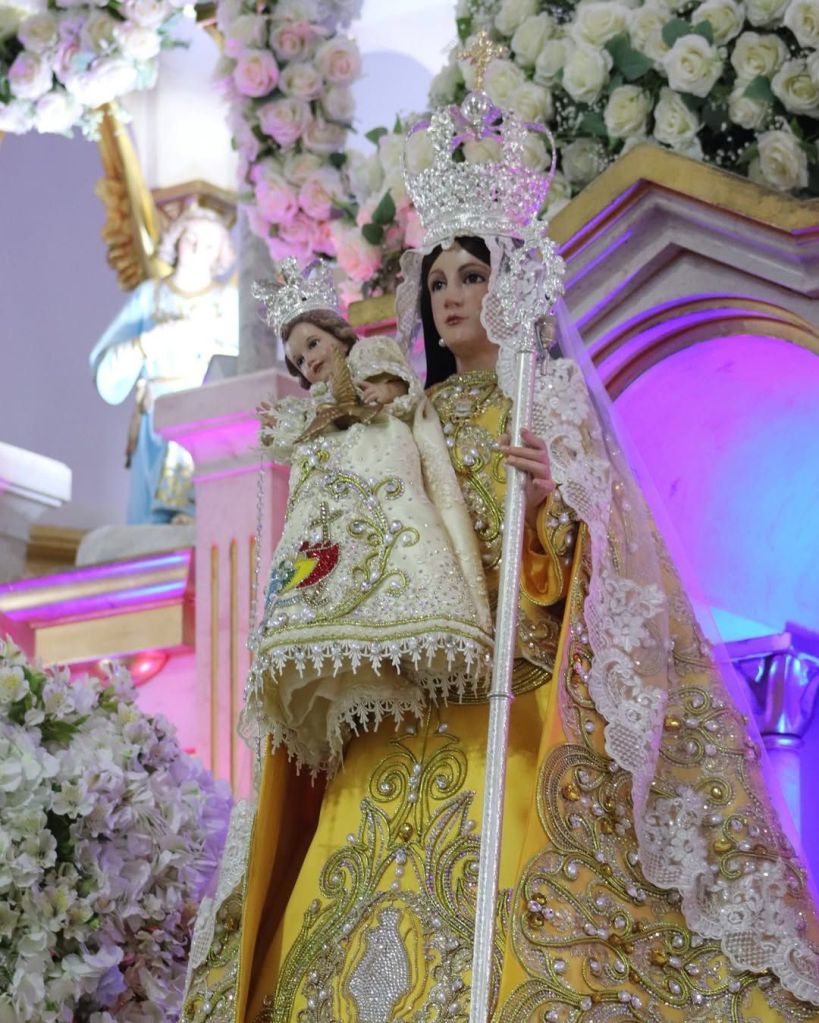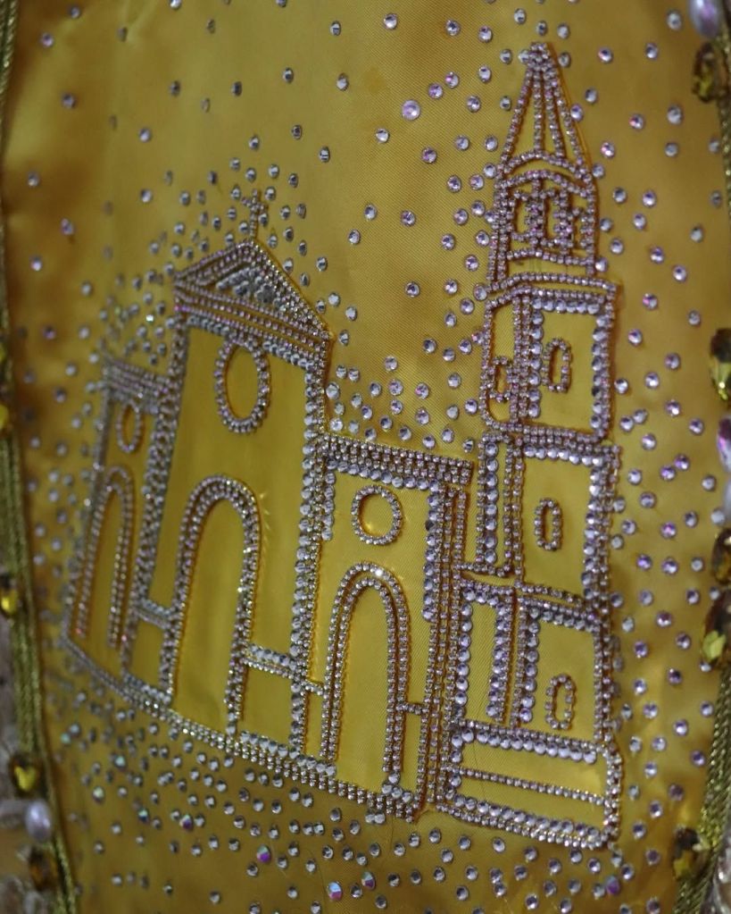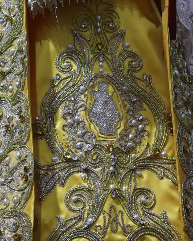«La pieza está elaborada en tonos amarillos vibrantes, reflejando la luz y la esperanza que emanan de su figura.Cada pliegue del tejido está adornado con piedras preciosas que brillan como estrellas, simbolizando la riqueza de la fe y la devoción de los chamariaperos. Este hermoso atuendo no solo destaca la belleza de la Virgen, sino que también representa el amor y la tradición de su comunidad», colgaron en @santuariodelacandelaria2