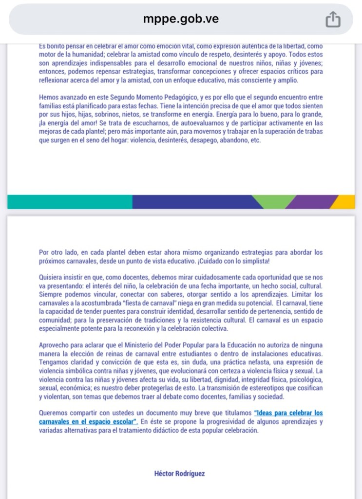 El Ministerio de Educación de Venezuela, bajo la dirección del Ministro Héctor Rodríguez, ha emitido un comunicado (Boletín 16) que prohíbe la elección de reinas de carnaval en las instituciones educativas de todo el país. Esta decisión busca abordar preocupaciones sobre la violencia y el sexismo que pueden surgir de estas prácticas.