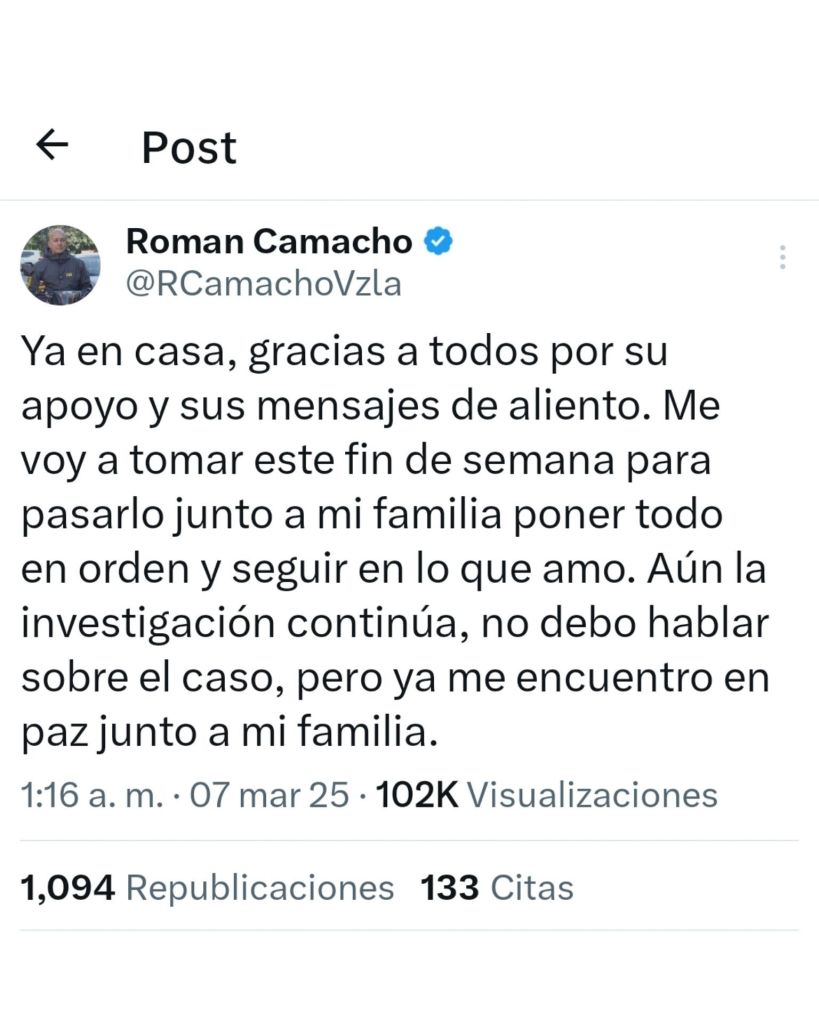 El periodista de sucesos Román Camacho informó en sus redes sociales a la 1 de la mañana de este viernes 7 de marzo, que ya se encuentra en su casa.